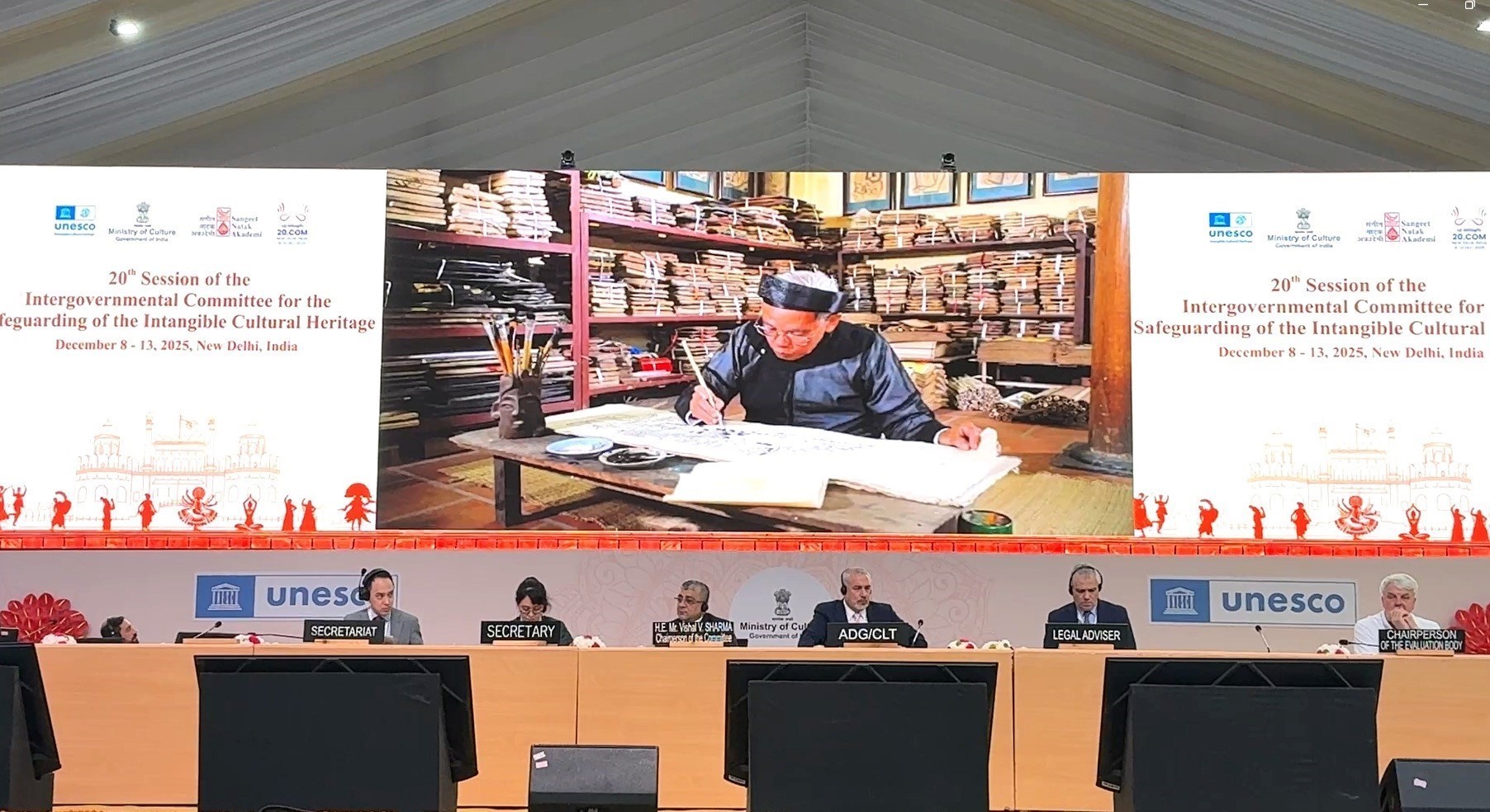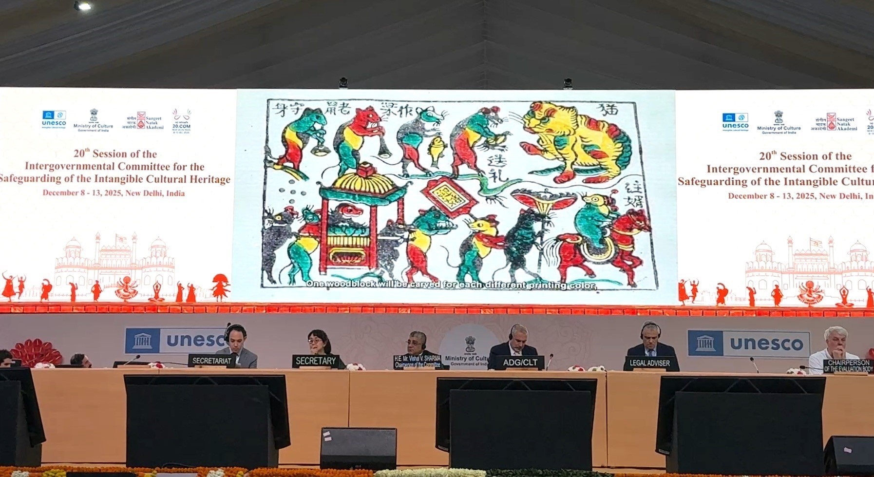 Không gian tranh dân gian Đông Hồ được trình chiếu tại kỳ họp của Unesco tại New Delhi vào tháng 12/2025, trước thời điểm được vinh danh. Ảnh: Ngọc Thúy - TTXVN