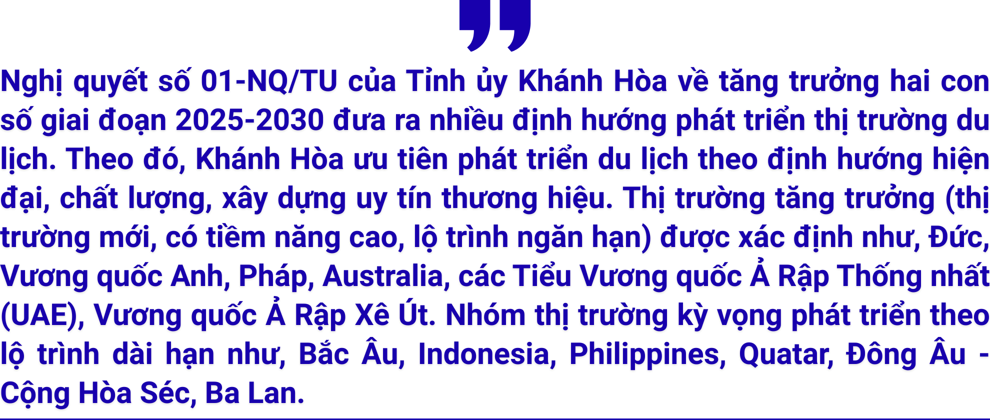 Nghị quyết 09-NQ/TW của Bộ Chính trị (khóa XIII) về xây dựng, phát triển tỉnh Khánh Hòa đến năm 2030, tầm nhìn đến năm 2045 xác định rõ mục tiêu đến năm 2030: “Khánh Hòa là thành phố trực thuộc Trung ương trên cơ sở phát huy cao độ tiềm năng và lợi thế về biển, là đô thị thông minh, bền vững, bản sắc và kết nối quốc tế, là trung tâm dịch vụ, du lịch biển quốc tế…”.