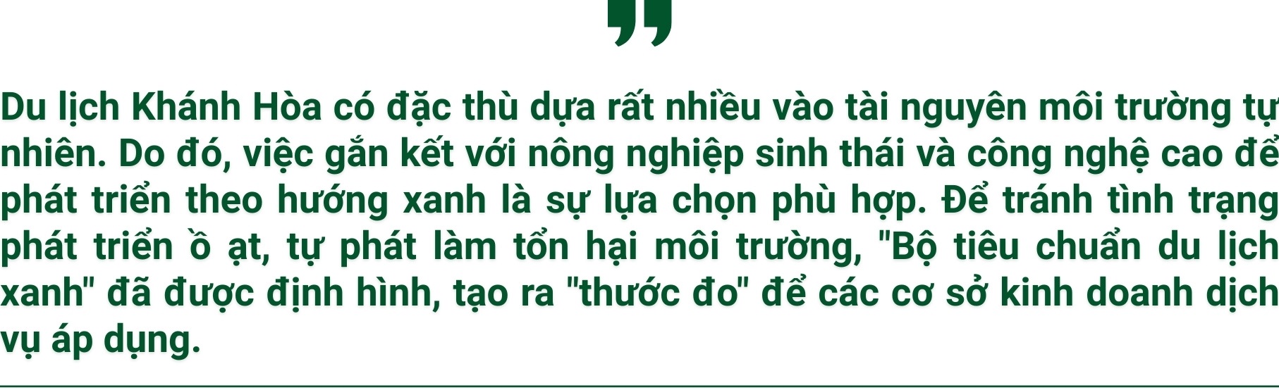 Ông Phạm Minh Nhựt, Chủ tịch Hiệp hội Du lịch Nha Trang - Khánh Hòa cho biết, "Bộ tiêu chuẩn du lịch xanh" với các quy định rất khắt khe gồm 102 tiêu chí dành cho cơ sở lưu trú và 100 tiêu chí dành cho điểm tham quan. Trọng tâm của bộ tiêu chuẩn là bảo vệ môi trường, lấy chất lượng dịch vụ và sự hài lòng của du khách làm trung tâm. Đây sẽ là "bộ lọc" giúp loại bỏ các mô hình làm ăn chộp giật, đồng thời giúp doanh nghiệp tối ưu hóa chi phí và nâng cao hiệu quả khai thác.