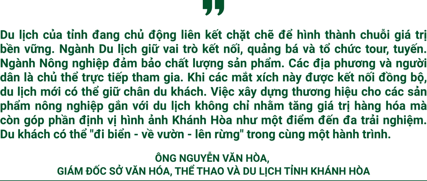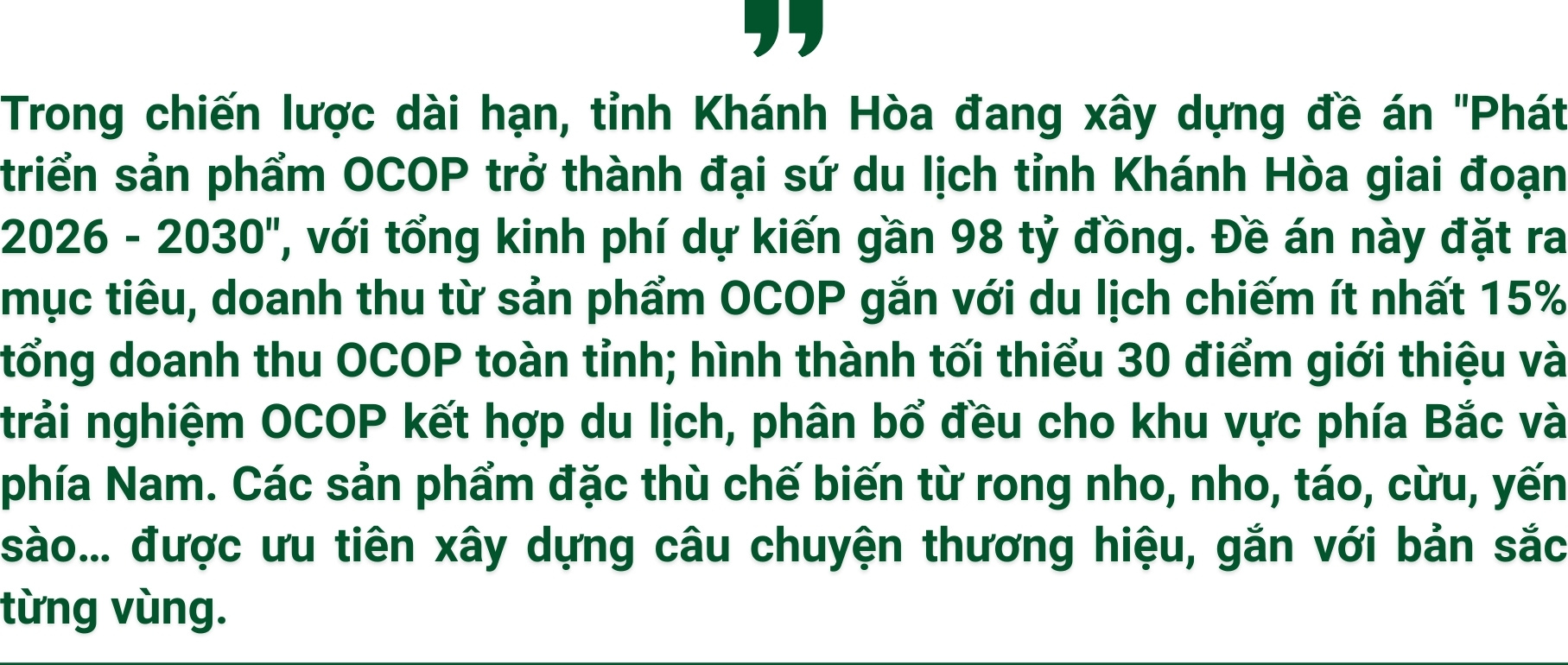 Bước chuyển mình của Khánh Hòa sau sáp nhập đang tạo ra động lực phát triển mới, mở ra không gian và dư địa tăng trưởng rộng lớn. Để hiện thực hóa khát vọng trở thành thành phố trực thuộc Trung ương, đòi hỏi Khánh Hòa phải triển khai đồng bộ chiến lược phát triển đa giá trị, nhất là du lịch. Với hàng trăm sản vật OCOP, kỳ vọng những món quà quê sẽ góp phần lan tỏa và xây dựng thương hiệu du lịch bền vững cho xứ Trầm Hương.
