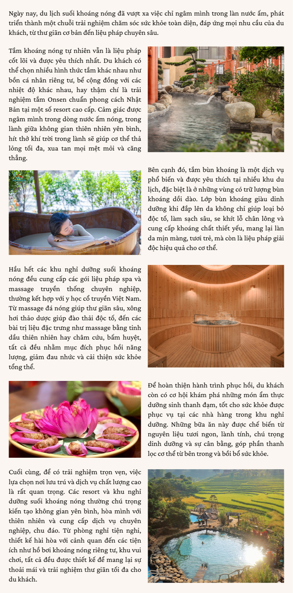 Nổi lên như một liệu pháp tự nhiên đầy hấp dẫn, du lịch suối khoáng nóng ở Việt Nam chính là một "viên ngọc quý", mang đến cơ hội tái tạo năng lượng, chăm sóc sức khỏe và hòa mình vào thiên nhiên hùng vĩ. Với nhiều suối khoáng tự nhiên sở hữu giá trị y học cao và những câu chuyện văn hóa, lịch sử thú vị, đây là lựa chọn lý tưởng cho một hành trình tìm về bình an đích thực.