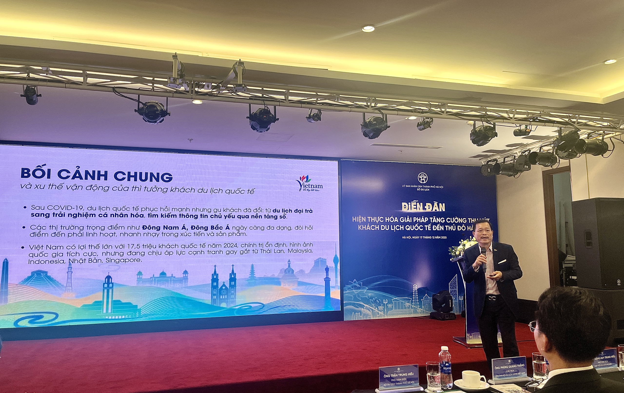 Ông Bùi Minh Chiến, đại diện Vietnam Airlines đề nghị: "Cần nâng cao trải nghiệm của du khách ngay từ cửa ngõ, như tại sân bay Nội Bài; các đơn vị hàng không – lưu trú – lữ hành có thể phát triển các gói sản phẩm đồng thương hiệu, như combo vé máy bay – khách sạn – trải nghiệm Hà Nội với các tour văn hóa, giải trí, chăm sóc sức khỏe".