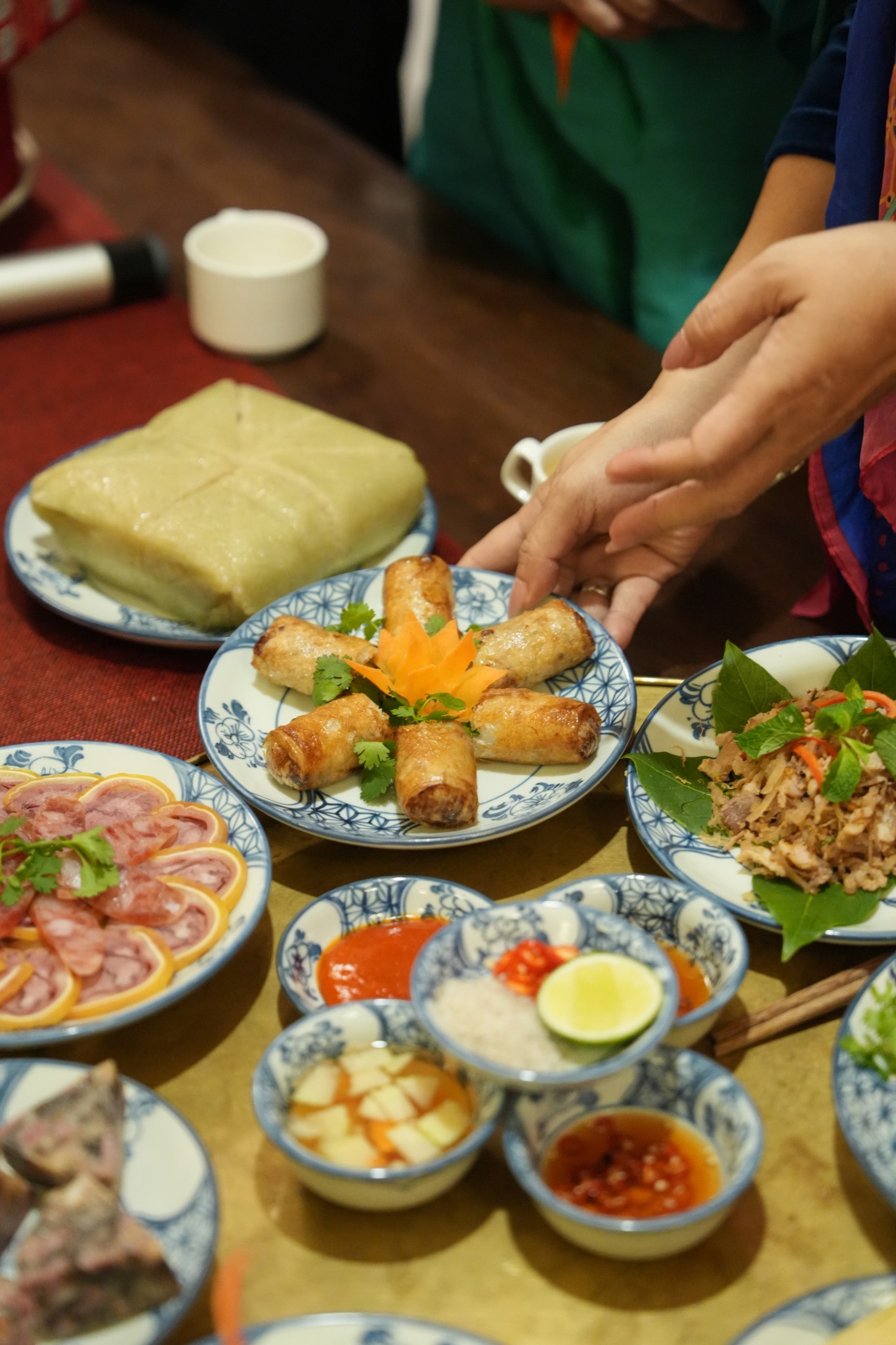 Các món ăn truyền thống như bánh chưng, nem rán, dưa hành, thịt gà luộc,... được giới thiệu đến thực khách