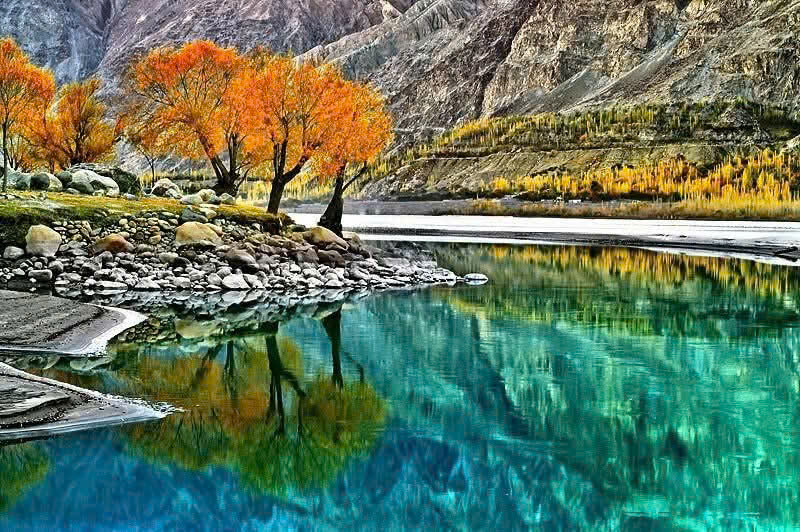 Mùa Thu (Tháng 9 – Tháng 11): Vũ điệu vàng son Có lẽ đây là mùa quyến rũ nhất tại Pakistan. Toàn bộ cảnh sắc chuyển sang tông màu vàng, cam và đỏ rực rỡ. Những hàng cây phong, cây dương soi bóng xuống mặt hồ xanh ngọc bích tạo nên một bức tranh sơn dầu sống động. Đi dạo trên những con đường phủ đầy lá vàng rơi ở Gilgit-Baltistan là trải nghiệm lãng mạn không thể nào quên.