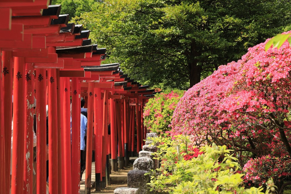Hoa Đỗ quyên khoe sắc bên cạnh dãy cổng Torii tại đền Nezu