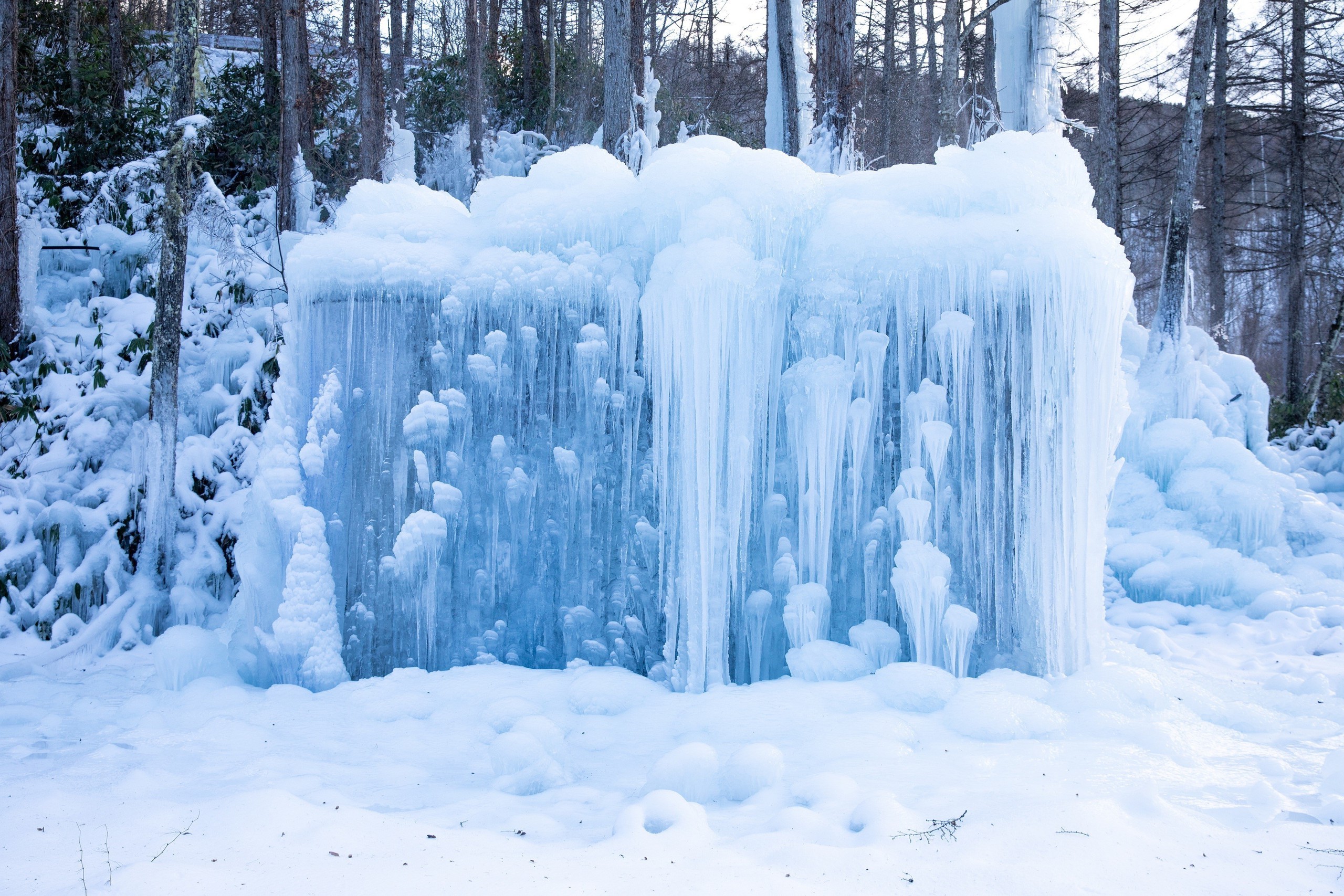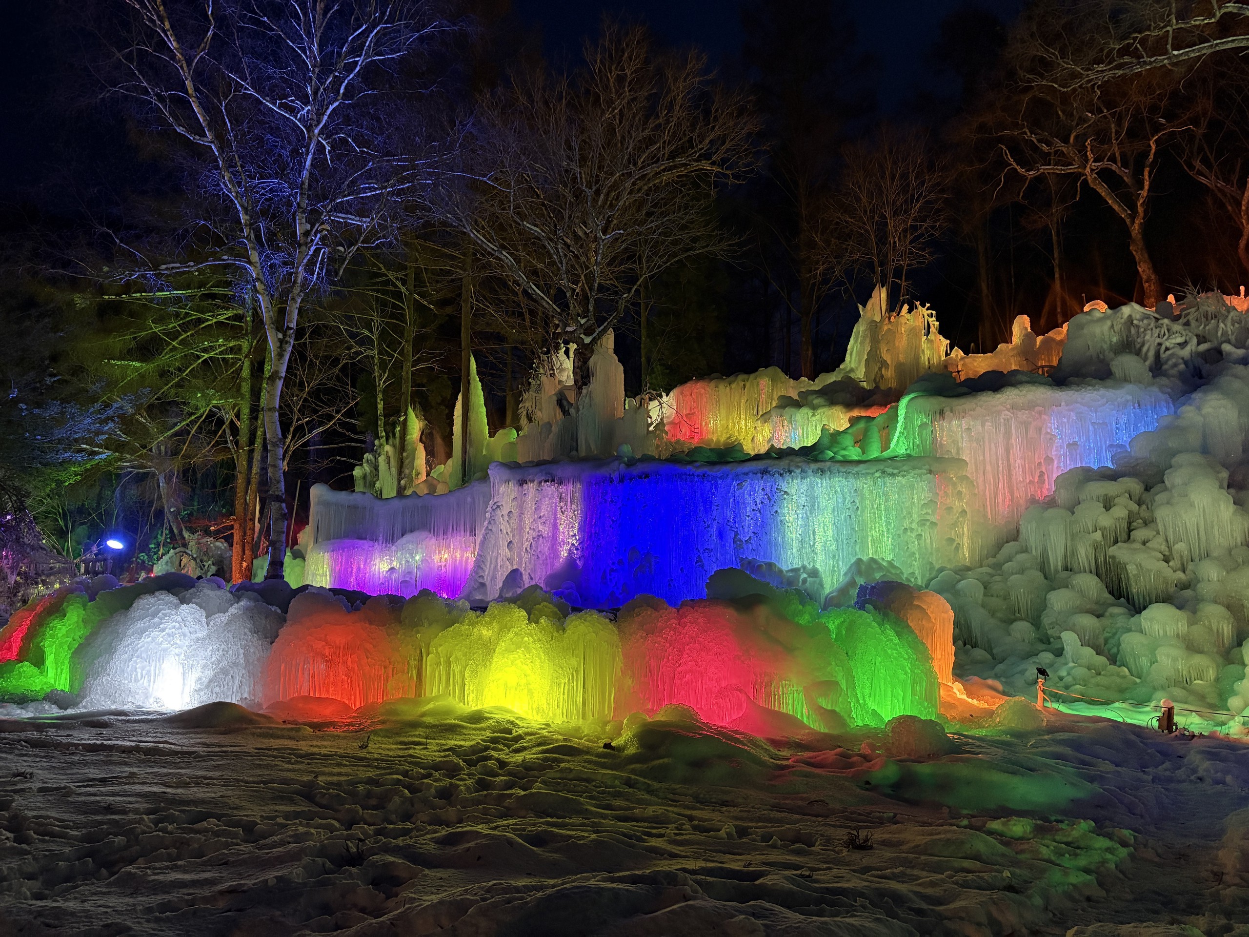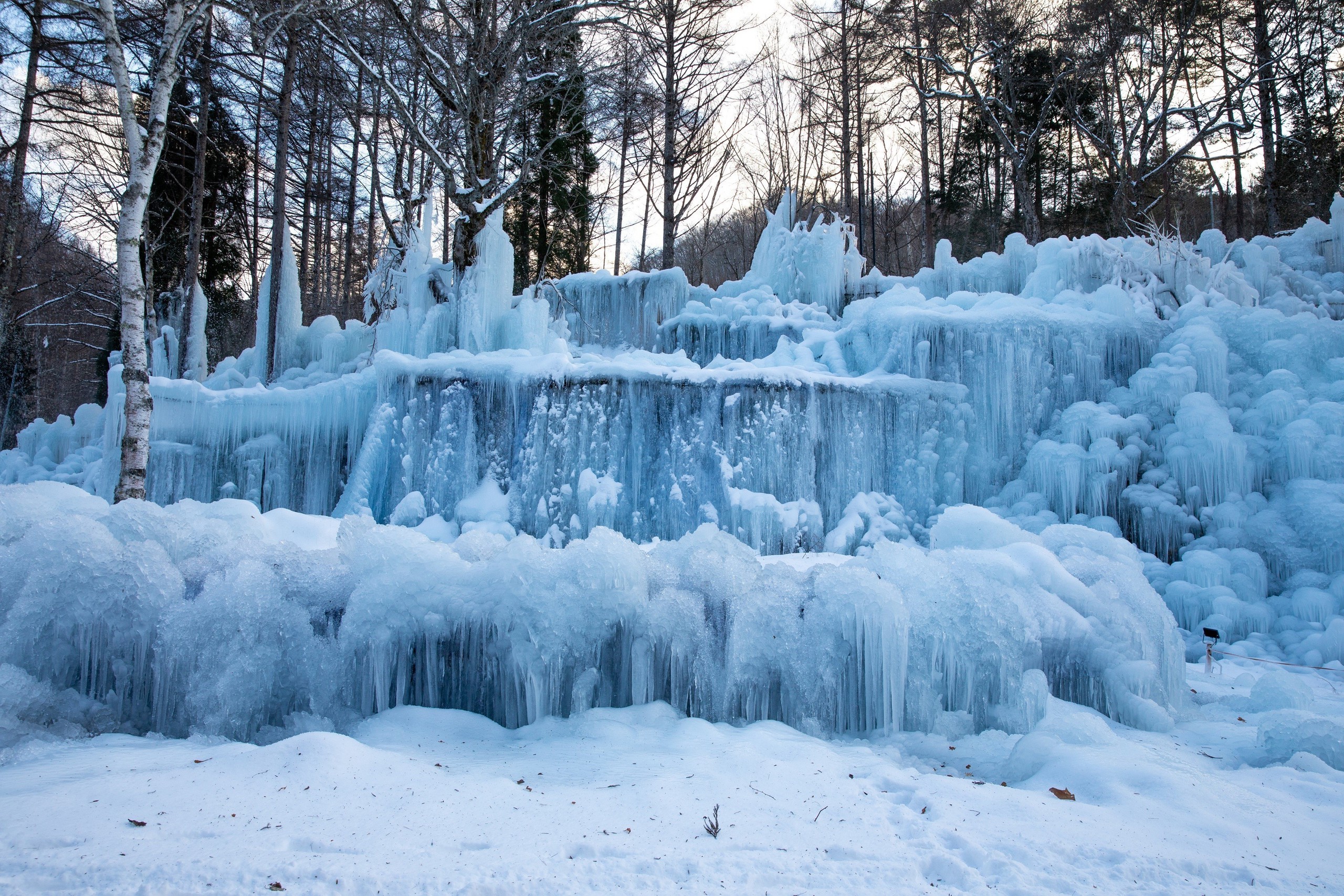 Mỗi mùa Đông, nước được phun liên tục lên cây cối, khung gỗ, sau đó đóng băng tự nhiên thành những cột băng, thác băng và mảng băng treo lấp lánh